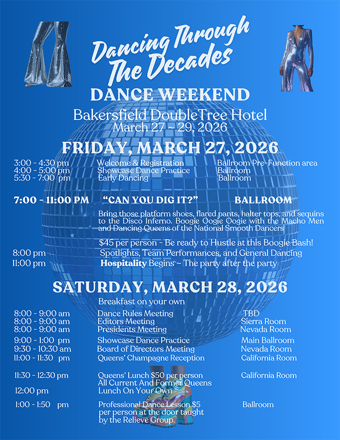 “Dancing Through the Decades”, will be held March 28, 29, 2026 at the The Doubletree Hotel located at 3100 Camino Del Rio Court, Bakersfield, CA 93308.